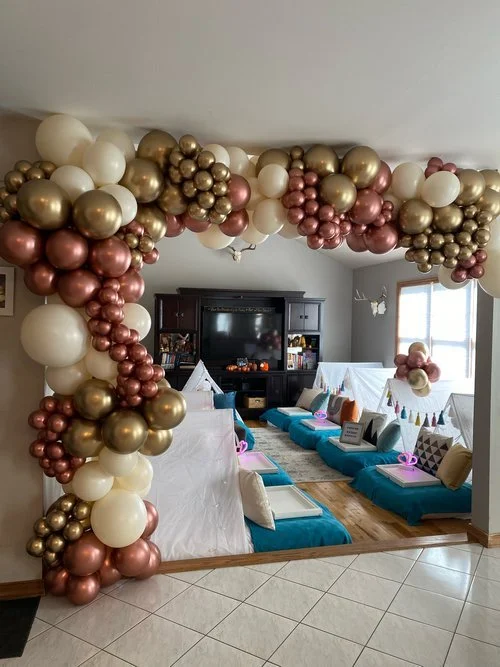 organic balloon garland plus gold shimmer wall