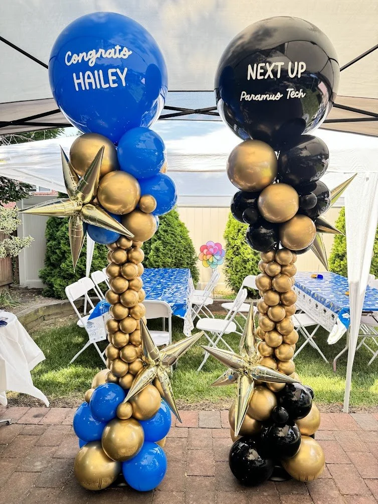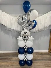 includes latex balloons on top and bottom of tower plus foil or paper tassels and a personalized message up to three words. Each additional word is $5.